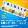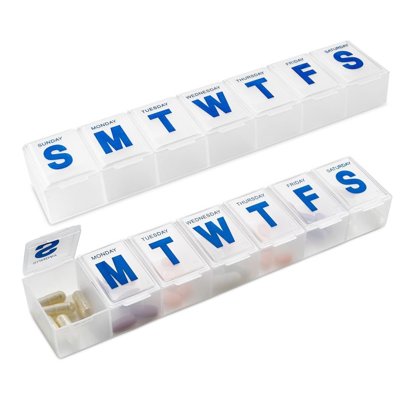 Our weekly pill reminder comes in unique design. The lids are labeled with the first letter of a weekday so that you can plan your medication for a week, with minimal chance of missing a dose.