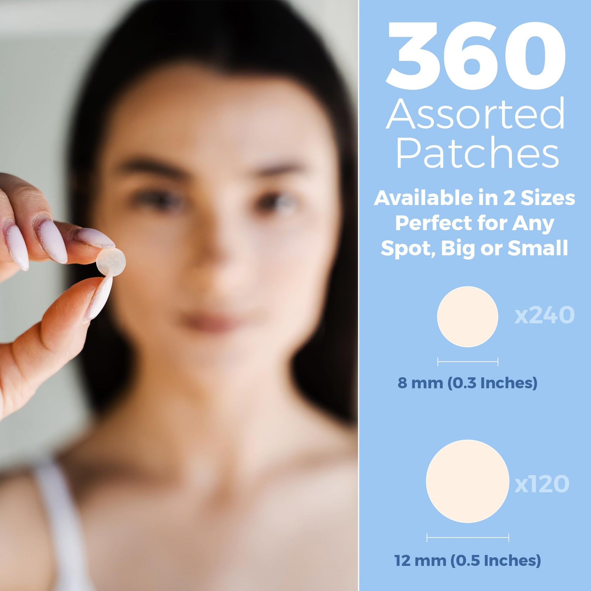 - PACK OF 360 ACNE PATCHES IN 2 SIZES: This value-packed set includes 360 acne patches in 2 versatile sizes (8mm & 12mm), perfect for targeting every type of blemish. Whether you're dealing with small whiteheads or larger cystic acne, our pimple patches fit comfortably, helping you cover and treat multiple spots simultaneously.