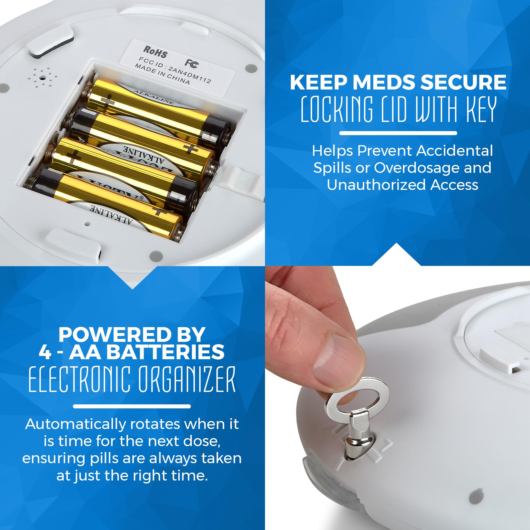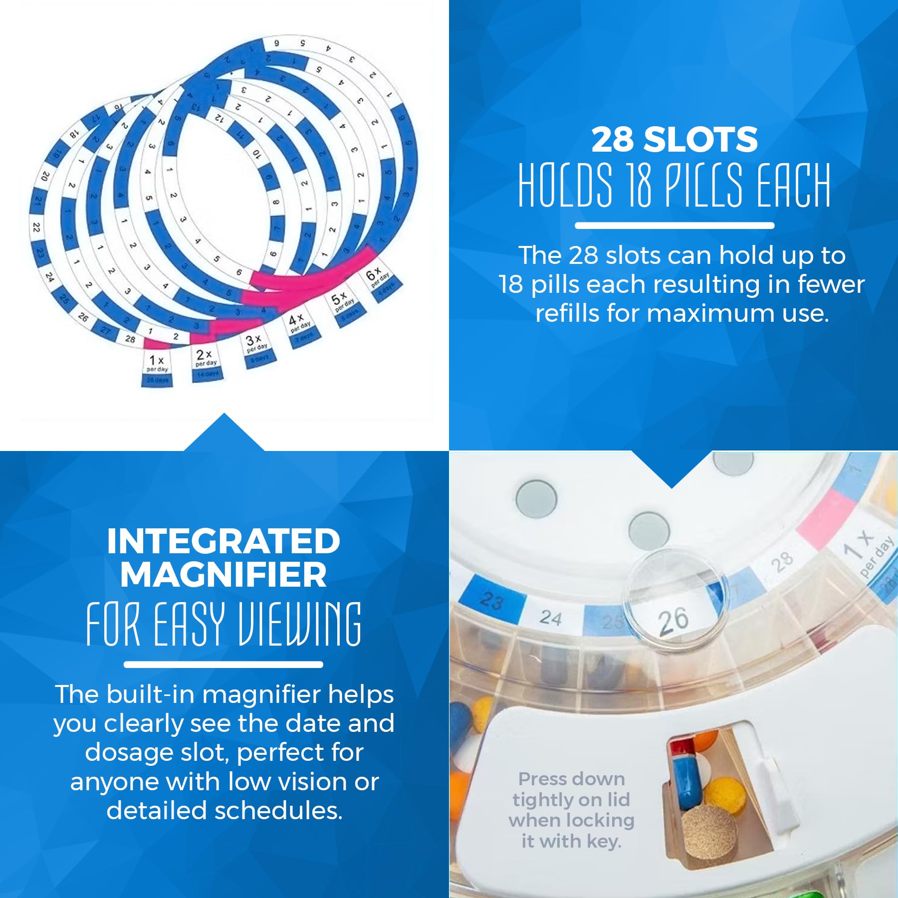 - LOCKING LID WITH KEY - KEEPS MEDICATIONS SECURE: Because of the locking cover with included key, accidental spills or overdosage and unauthorized access can be prevented. The battery powered carousel automatically rotates when it is time for the next dose ensuring pills are always taken at just the right time. An integrated magnifier on the lid allows for a close-up look of the day or order of the dose for easy confirmation.