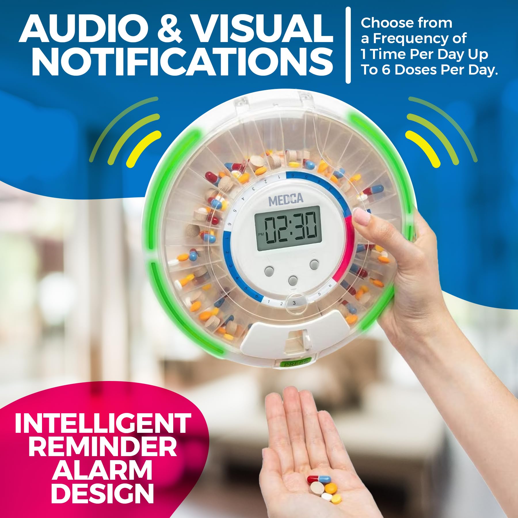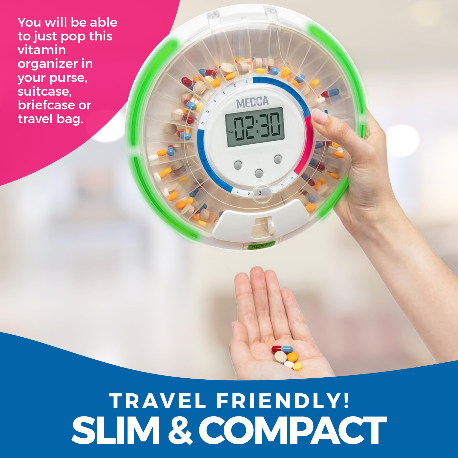 - PORTABLE AUTOMATIC PILL REMINDER: We've taken pill organizing to the next level with the MEDca Automatic Pill Dispenser. This 28-Day Electronic Medication Organizer ensures you take the right pills at the right time effortlessly because of the built-in alerts ensuring you never miss or prevent you from doubling your dose due to forgetfulness