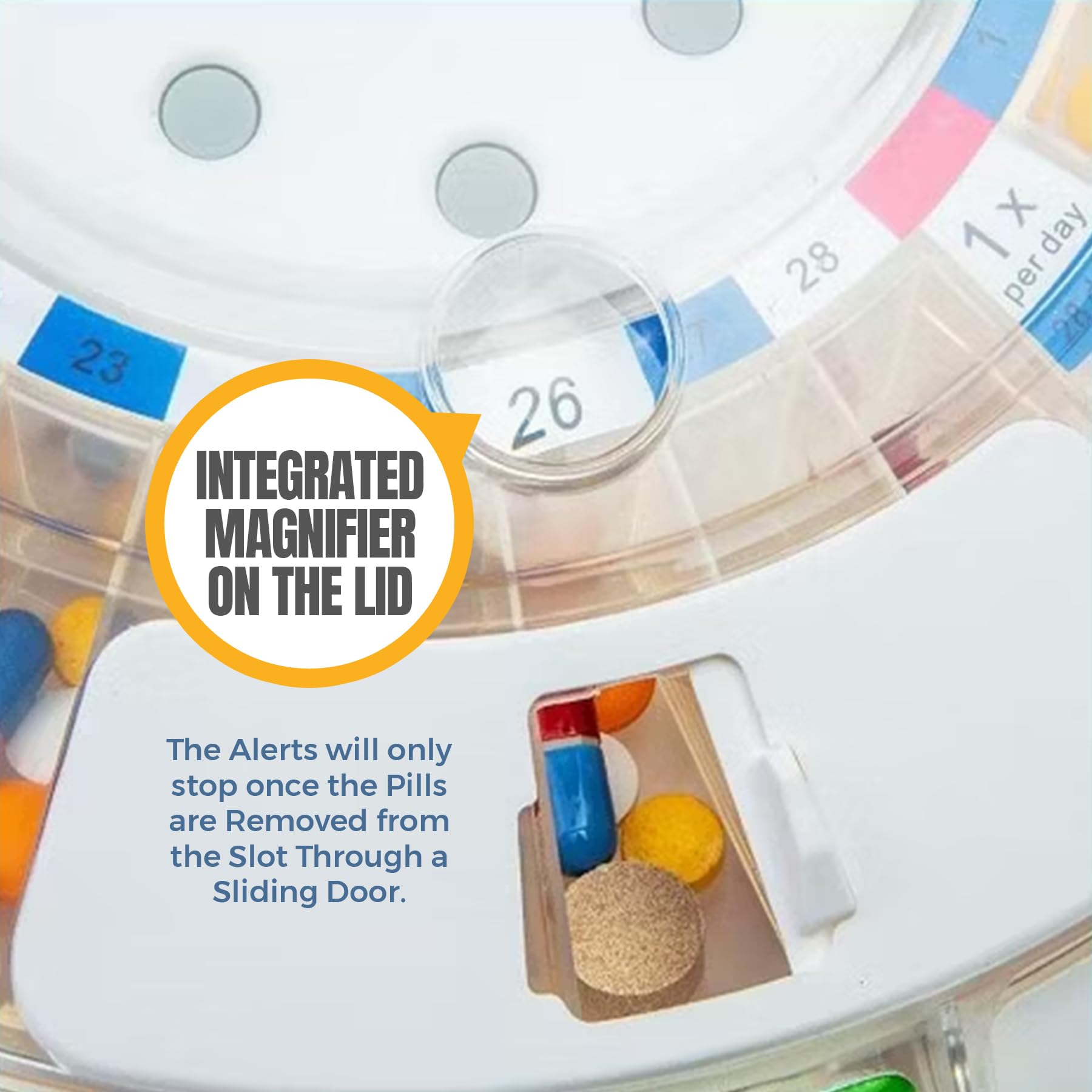 The 28 slots can hold up to 18 pills each resulting in fewer refills for maximum use. The 6 interchangeable dosage rings combined with the pre-programmed alerts that you can easily set up ensures no dosage will ever be missed. The alerts will only stop once the pills are removed from the slot through a sliding door.