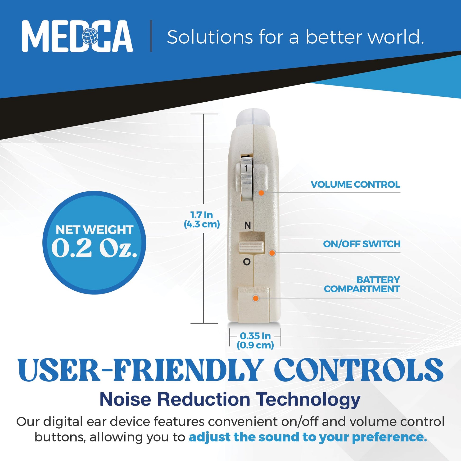 - UNMATCHED PERFORMANCE! COMFORTABLE AND DISCREET: Don't worry about carrying extra weight around. Because our MEDca BTE Hearing Amplifier is so small and light-weight, it fits any ear comfortably. This is great for you because it is versatile, easy to use, and has low battery consumption. This BTE amplifier is so small, discreet and comfortable you'll forget that you're wearing it.