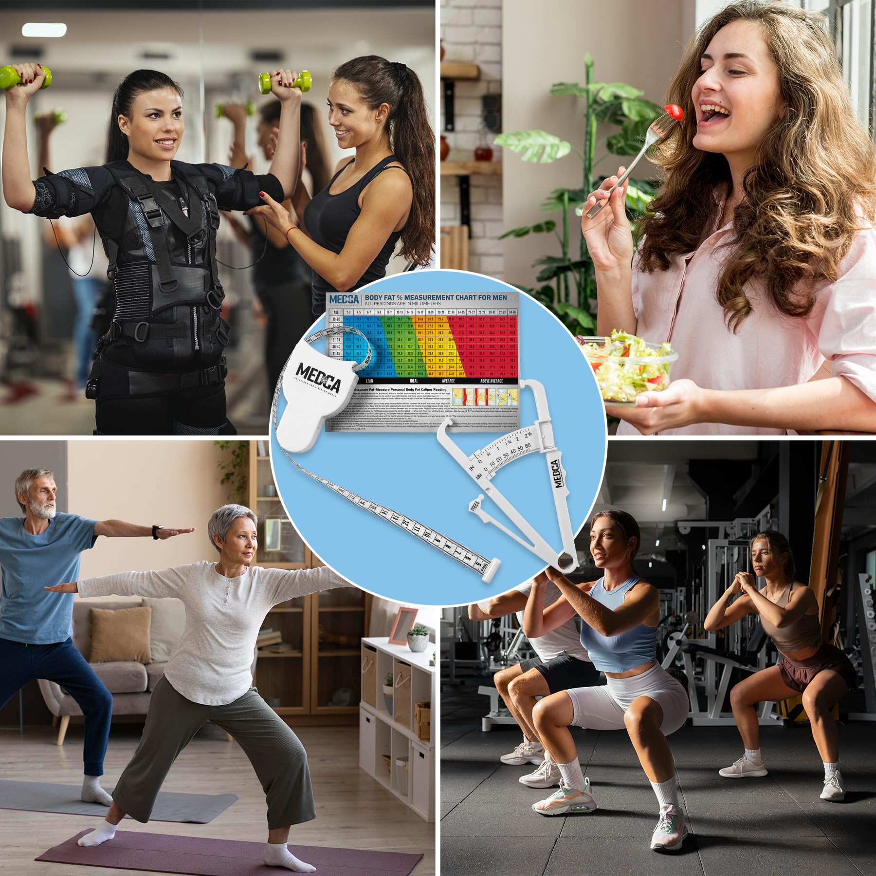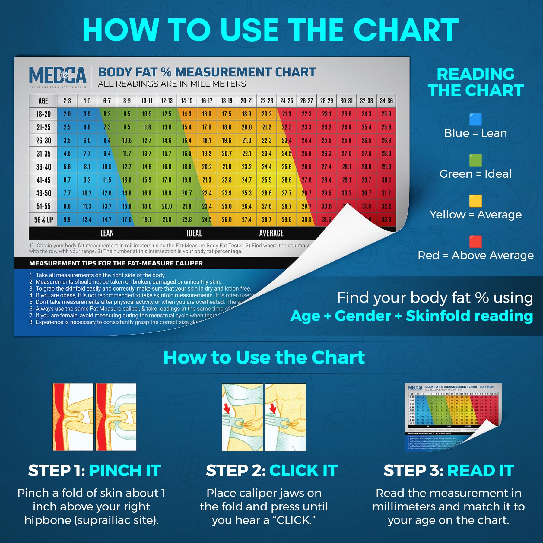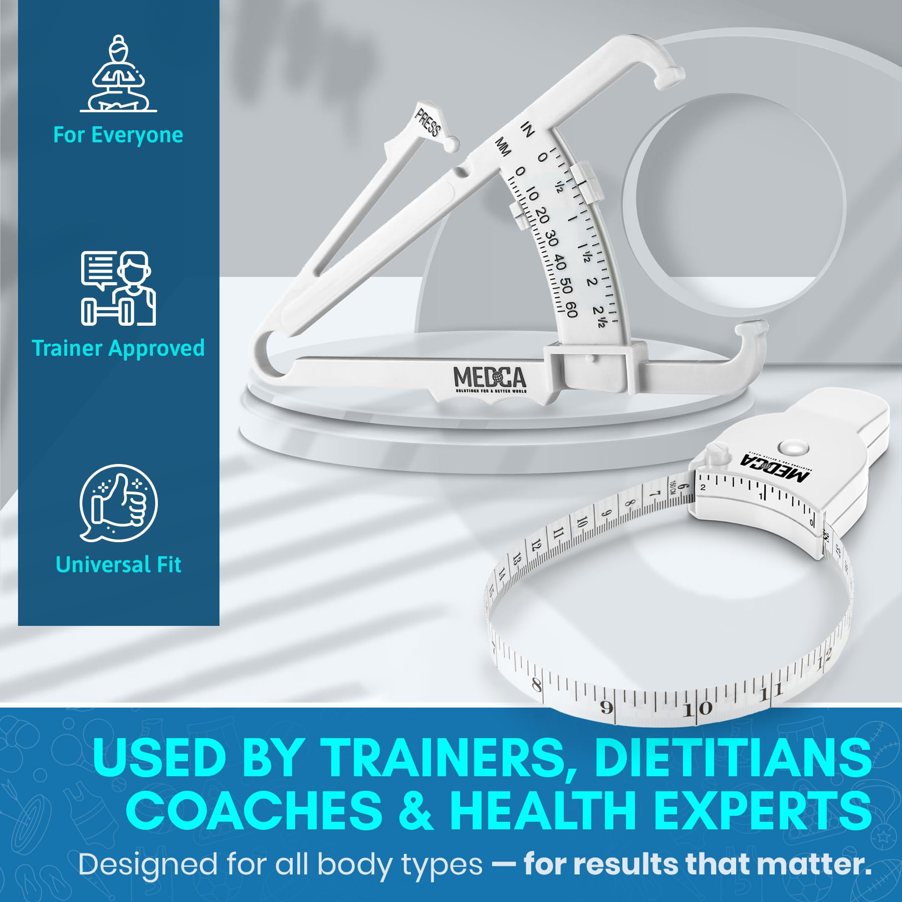 - IMPROVED DESIGN! ACCURATELY DETERMINE BODY FAT PERCENTAGE: Manage your health wisely with the newly designed MEDca Body Fat Caliper with body measurement tape and get very accurate consistant measurements every time. That's because our body fat caliper includes a full set including a click in caliper measure with slide ruler, instructional chart, and body measuring tape which means that you'll be able to measure your body fat content easily and accurately, resulting in more effective dieting!