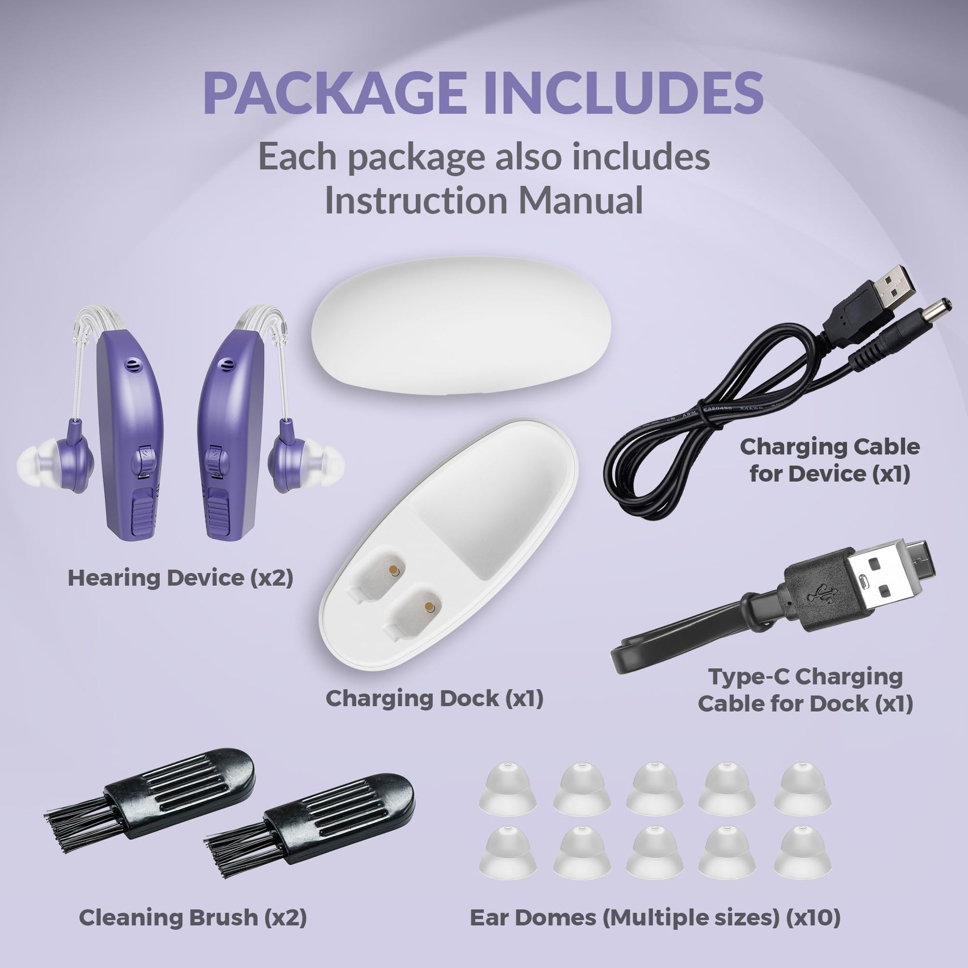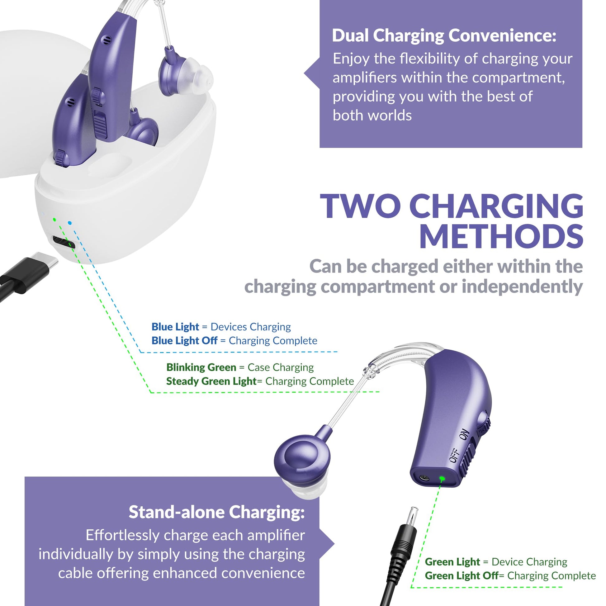 Digital Hearing Aid Amplifier Set - Premium Rechargeable Behind The Ear Personal Sound Amplification Device - for Adults and Seniors with All-Day Battery Life, (Pair, Purple)