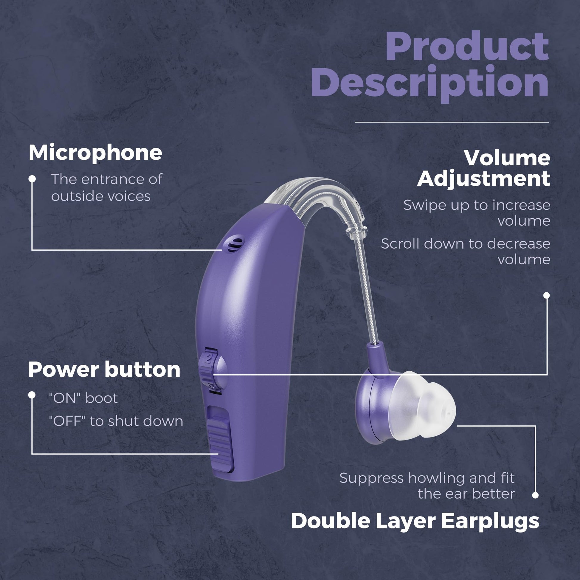 Helps you hear clearer while saving you money! Everybody deserves to hear to their best ability regardless of what they can or cannot afford. Our Digital Hearing Amplifier offers the most bang for your buck. Get your life back on track and enjoy the things you love again. Rechargeable Our Digital Hearing Amplifier has rechargeable batteries so you won't have to keep worrying about changing batteries. Use it all day on a single charge. Unlike other brands, our amplifier device can be used immediately out of the box. No set-up or tuning required. Noise reduction and cancellation provide high-quality crisp, natural sound. You can hear conversations audibly as they happen and respond appropriately. Lightweight, Comfortable & Easy to Use.Technological advances enabled personal hearing devices to become more compact and streamlined that it's virtually invisible. Lightweight and comfortable enough that you can wear them for hours without any soreness to your ear. The adjustable hooks snugly fit behind the ears for added comfort. The volume can be easily controlled thru the dials on the side. With 6 modes to choose from, you can surely find a setting that's adequate for you. KEY FEATURES: Digital Sound Processing Chip Provides Clear Sounds Easy On/Off Button Lightweight and Discreet Noise Reduction & Feedback Cancellation Adjustable Ear Hooks For Added Comfort Rechargeable for up to 16 Hours Battery Life on Single Charge Fashionable Purple Color 100% SATISFACTION GUARANTEE Why Wait!? Click "Add to Cart" to buy a pair for the best results and maximize your savings today!