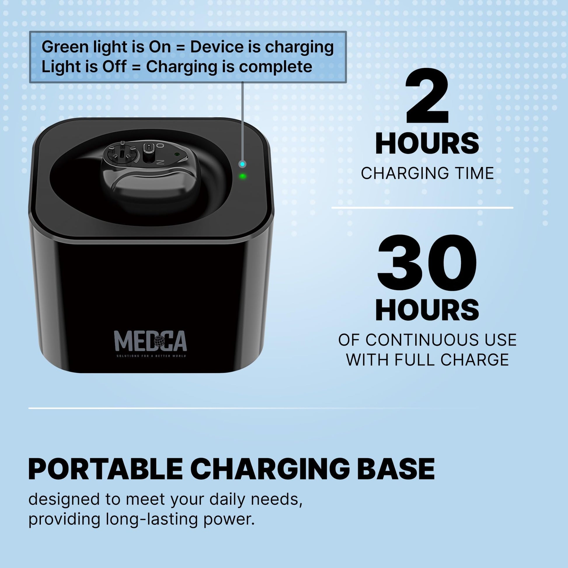 - PORTABLE CHARGING BASE WITH EXTENDED BATTERY LIFE: The MEDca hearing amplifier is designed to meet your daily needs, providing long-lasting power. With just 2 hours of charging, you'll be able to enjoy up to 30 hours of continuous use. The convenient USB-C charging base, ensuring portability and convenience on the go. The indicator status LED lets you easily monitor the charging progress.