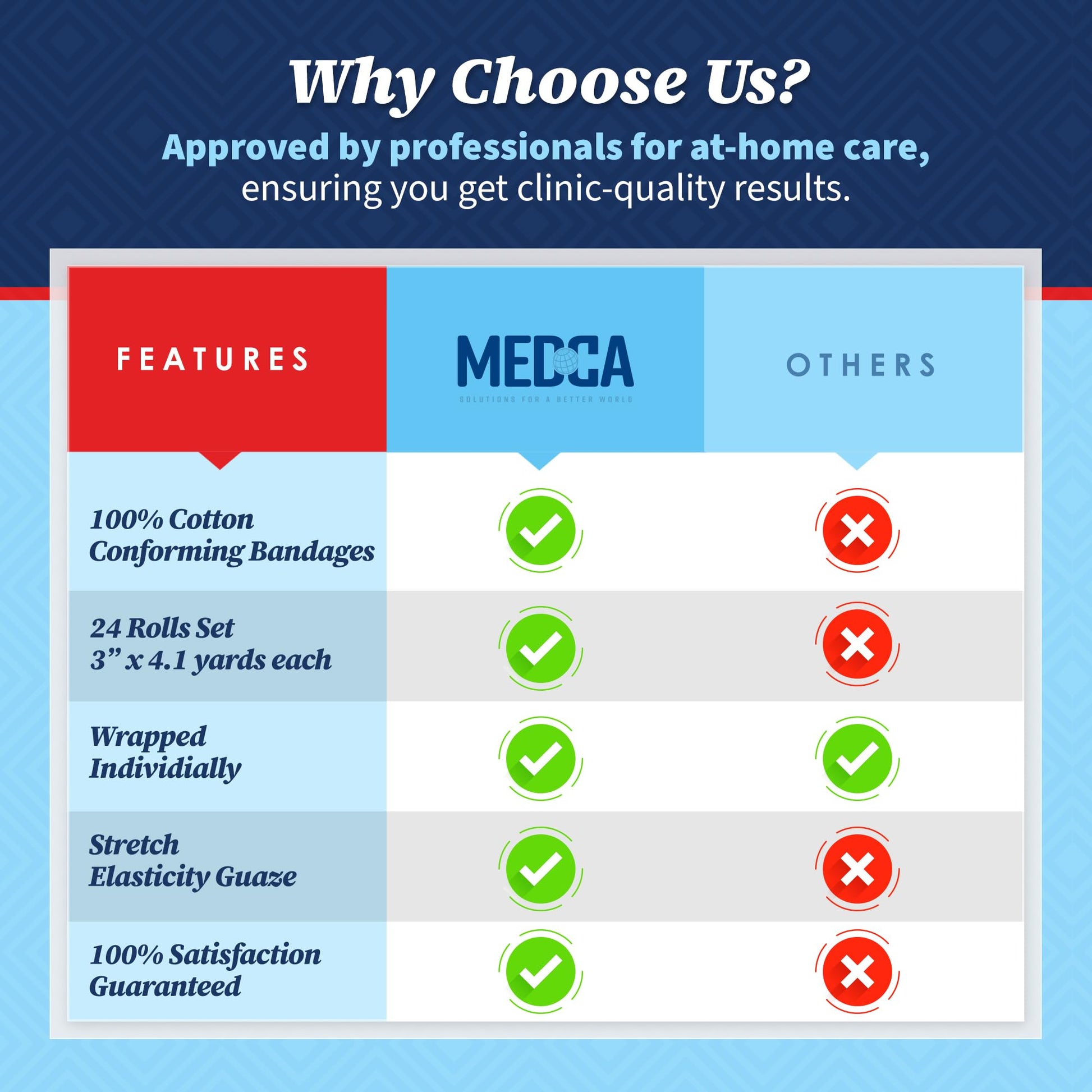 - [PACK OF 24] EACH 3" x 4.1 YARDS. TOP RATED CHOICE USED BY PROFESSIONALS: The MEDca medical gauze bandage rolls are highly trusted by medical professionals. What that means to you is that they are medically approved and safe to use. They help to keeping wounds clean, dry and free of infection, so that you'll be healthy and better in no time!