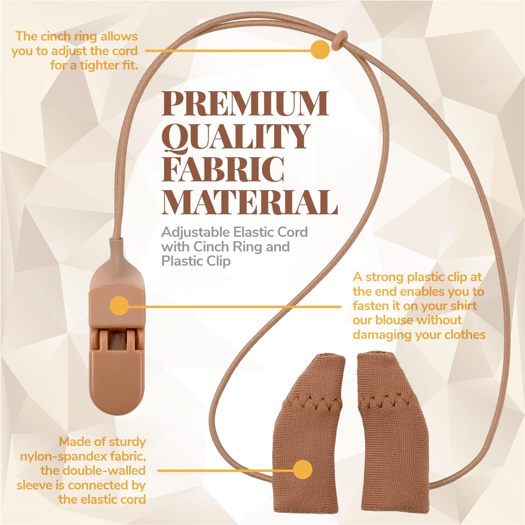 - PREMIUM QUALITY FABRIC MATERIAL: This innovative design features 3 components: the sleeve, cord, and clip. Made of sturdy nylon-spandex fabric, the double-walled sleeve is connected by the elastic cord. The cinch ring allows you to adjust the cord for a tighter fit. A strong plastic clip at the end enables you to fasten it on your shirt our blouse without damaging your clothes