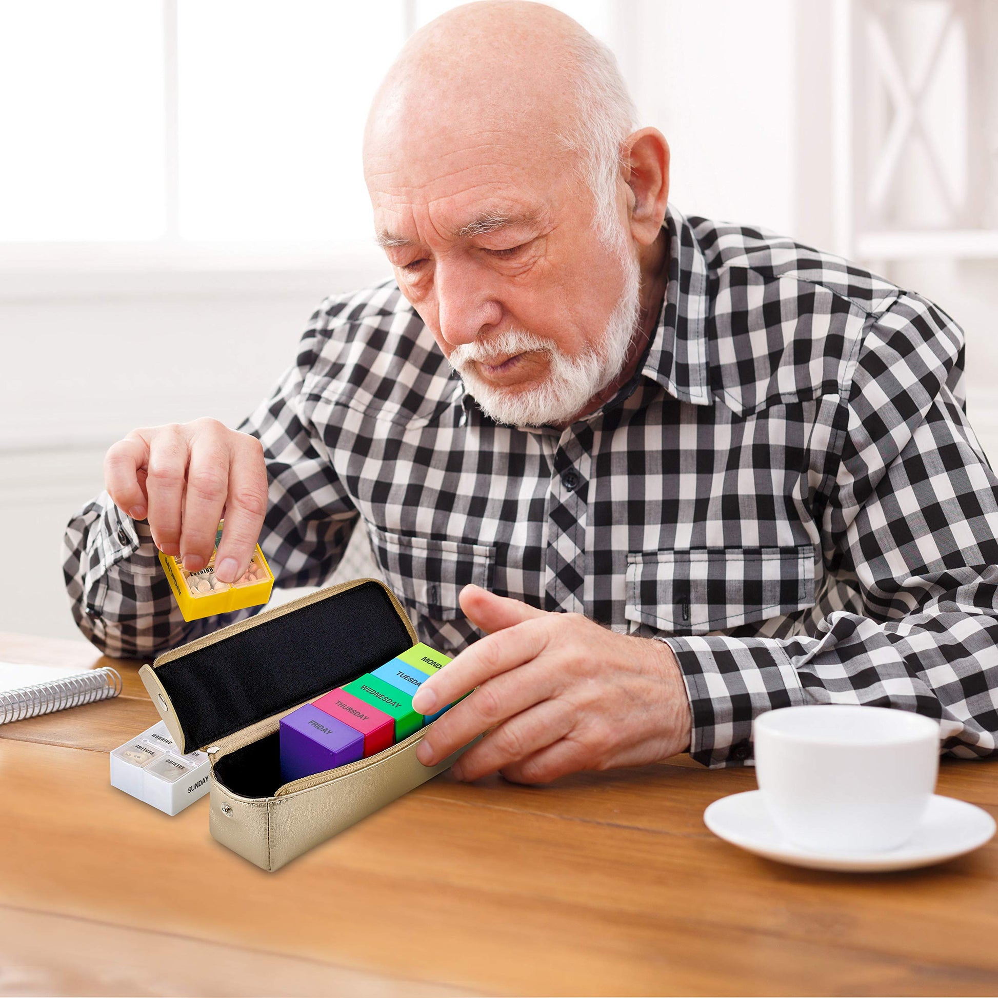- STYLISH & DISCREET LEATHER CASE: Don't be embarrassed of your pills & medications and store your pills in style. With our gold pu leather pill case you will be able to leave this stylish pill organizer on your bathroom vanity or countertop and the pill bottles back in your medicine cabinet. Reducing clutter and have your pills neatly stored where you can see them so you always remember to take them!