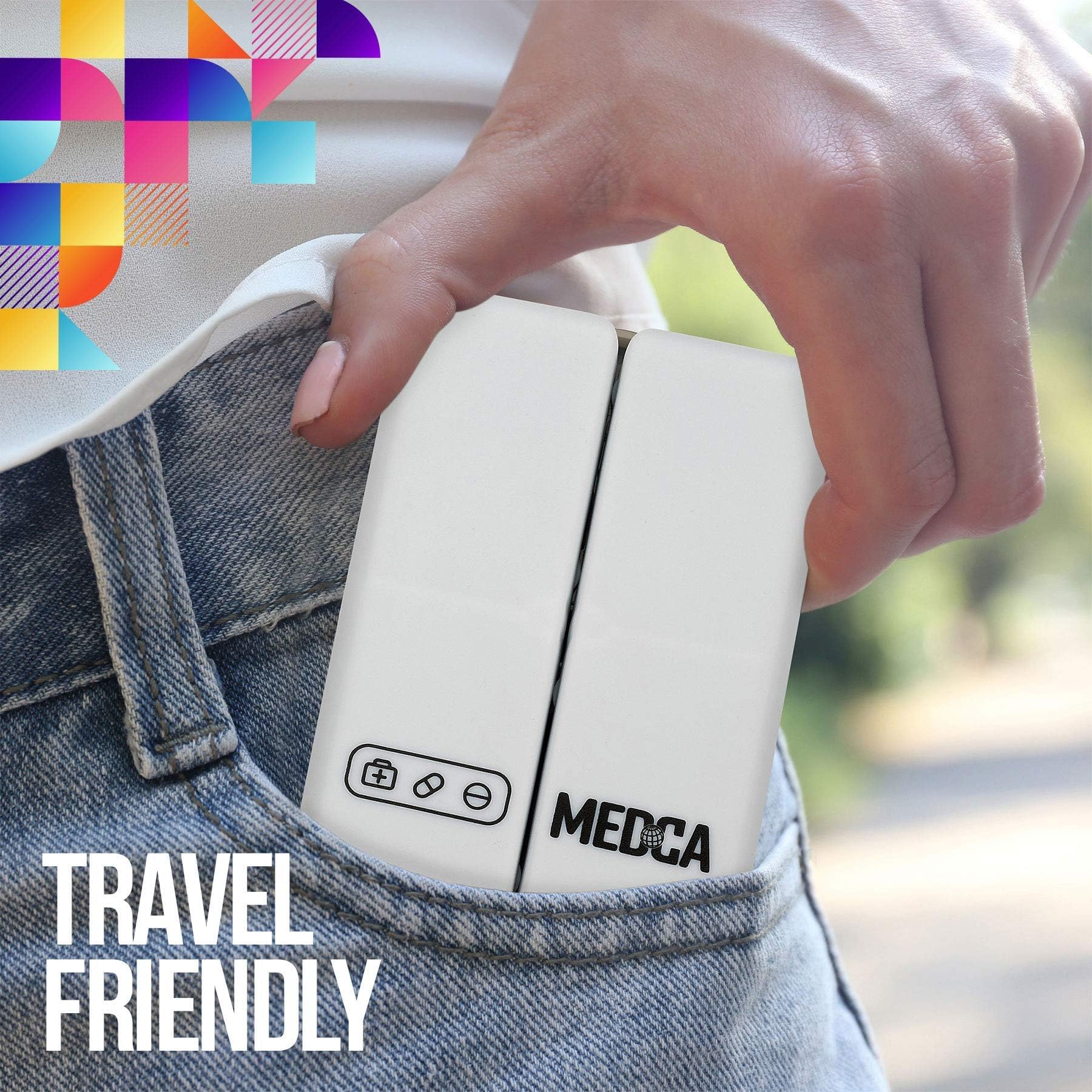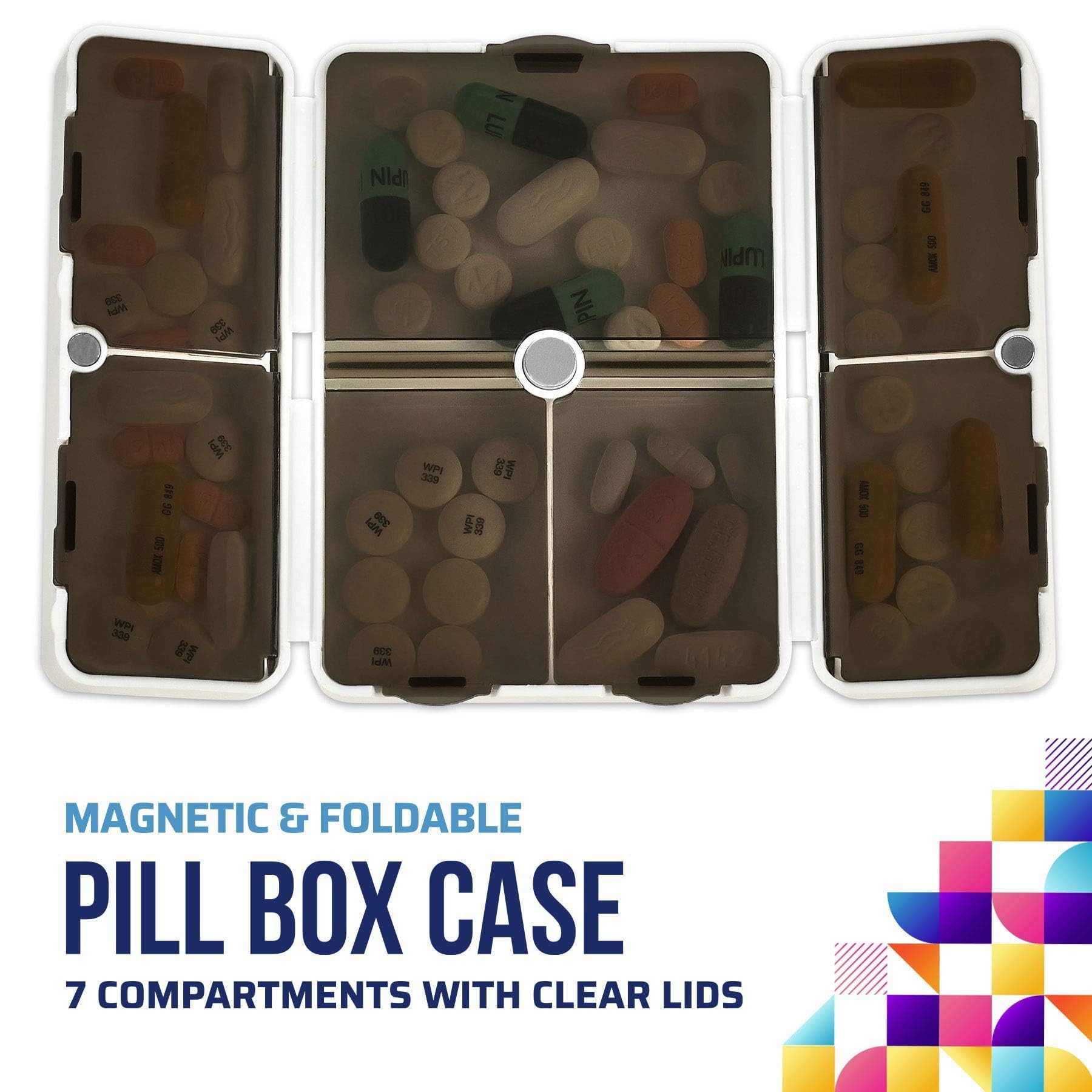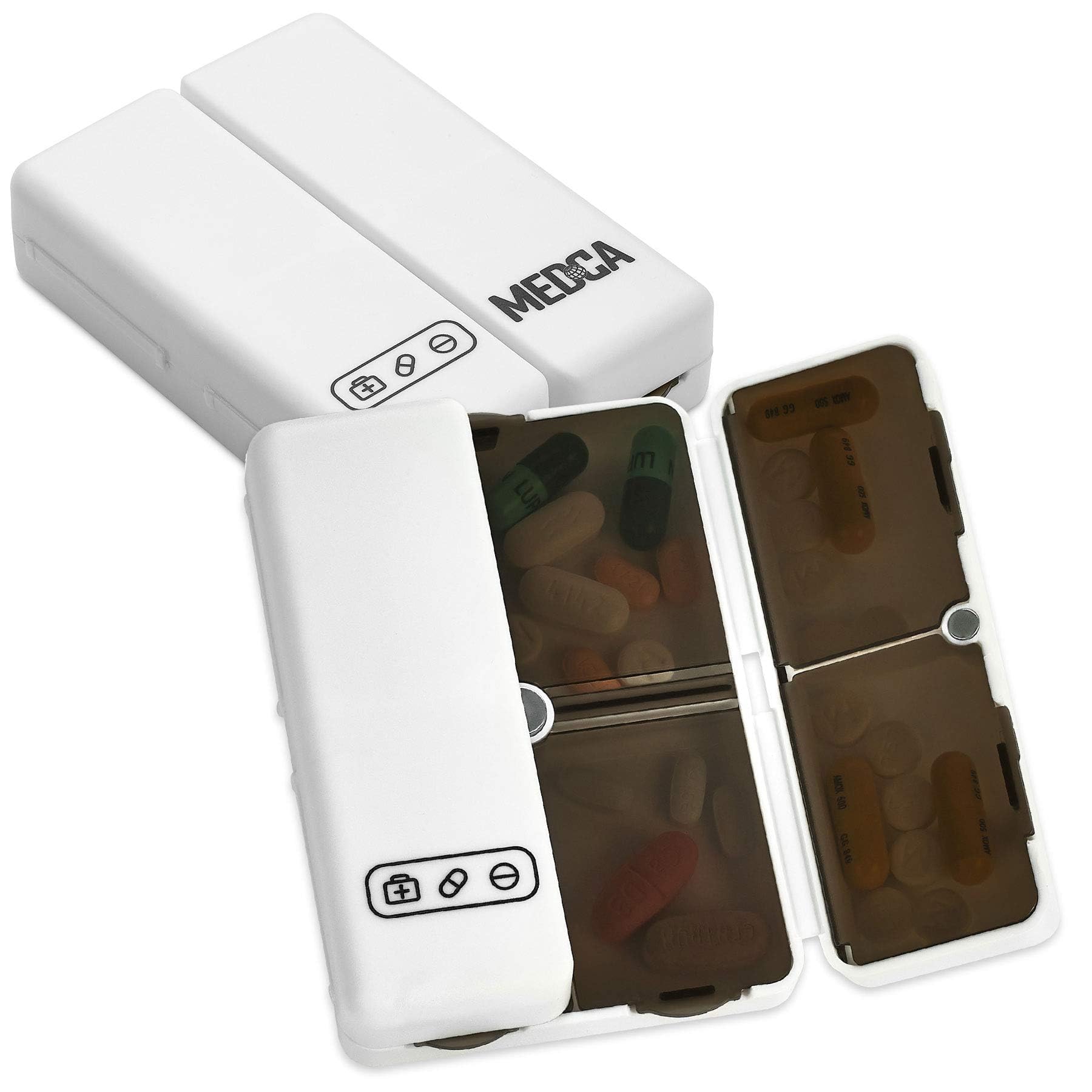 - PACK OF 2 - FOLDING 7 COMPARTMENT PILL ORGANIZERS: Bringing your pills and medication with you would be a lot simpler if you have a reliable and easy to use storage case. The New MEDca Magnetic Foldable Pill Box Case now has you covered. This compact and lightweight pill organizer will fit in your pocket, purse, pouch, and bag. Now you can always take your medication on the go and never forget another dose again!