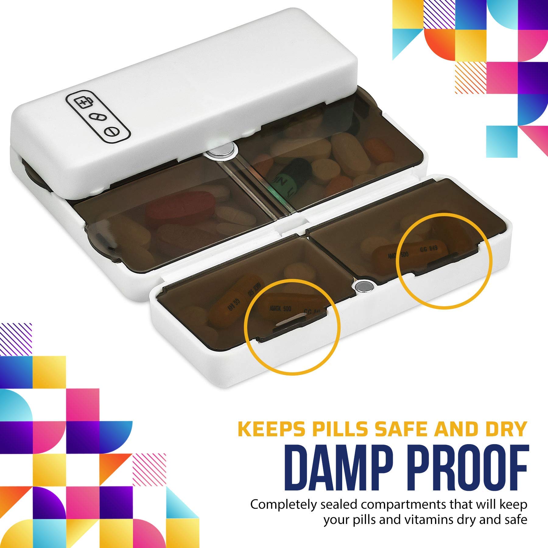 - CONVENIENCE RIGHT WHEN YOU NEED IT: Don't be fooled by its size. The MEDca magnetic pill organizer packs a big punch. With 6 small and 1 large compartments, you can fit all your daily pills, tablets, capsules, and vitamins in this container. Each compartment has a snap-lock lid protecting your medicine from moisture, dust, and other contaminants which can affect the efficacy of your medicine.