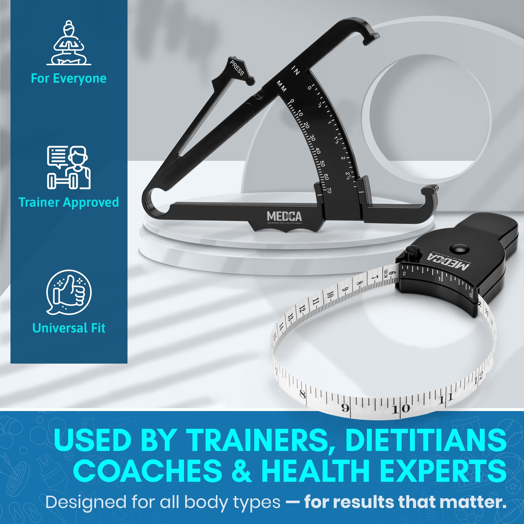 MEDca Body Fat Caliper and Measuring Tape for Body - Skinfold Calipers and Body Fat Tape Measure Tool for Accurately Measuring BMI Skin Fold Fitness and Weight-Loss, (Black)