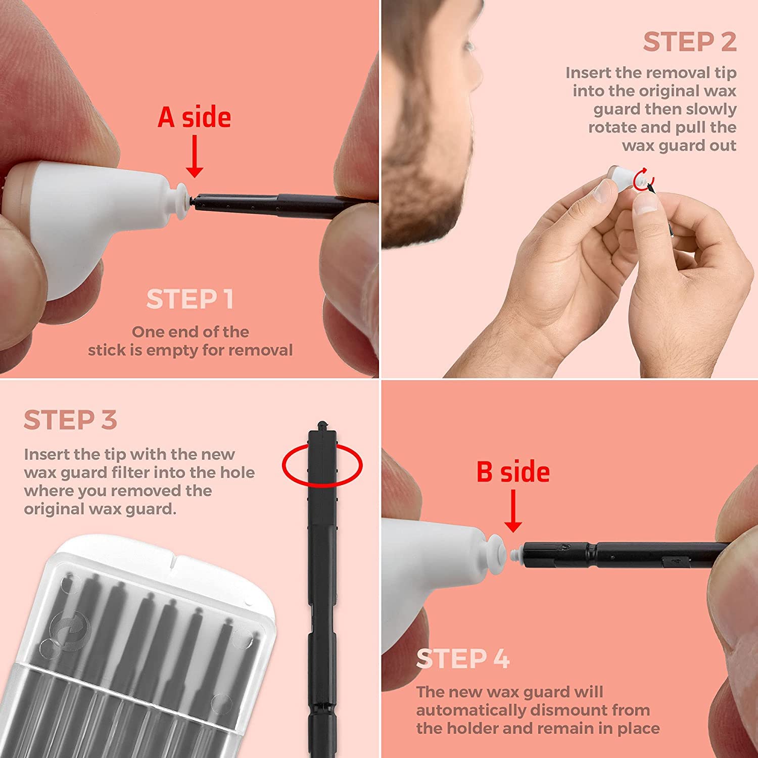 - SIMPLE & EASY TO USE: Replacing the ear wax guard filters only takes seconds. Take one stick out of the box and use the removal tip to get the original filter out of the device by slowly twisting it. Insert the new filter in. The new filter will lodge itself automatically in the hole but sometimes you might need to separate the filter from the stick with your nail