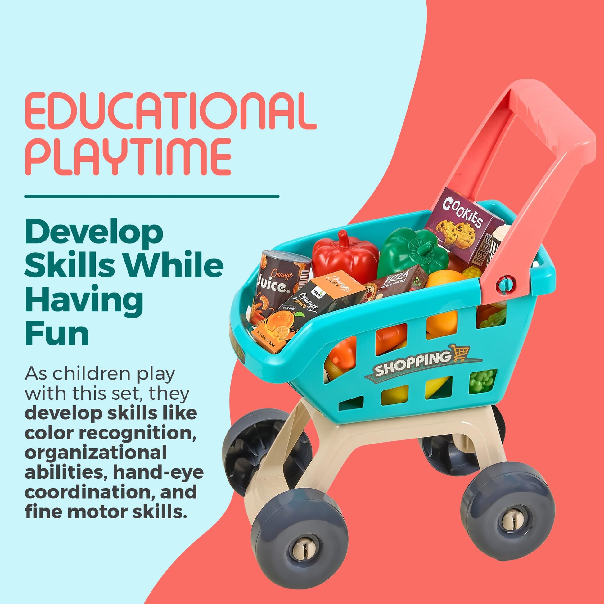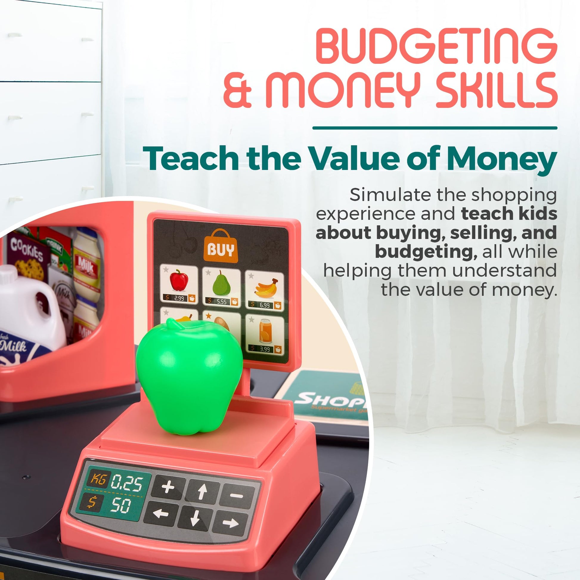 - EDUCATIONAL & FUN: While playing with the shopping set, your child will develop color recognition, organizational skills, hand-eye coordination, and fine motor skills. Simulating the shopping experience, your child will learn buying, selling, and budgeting at the same time learning the value of money