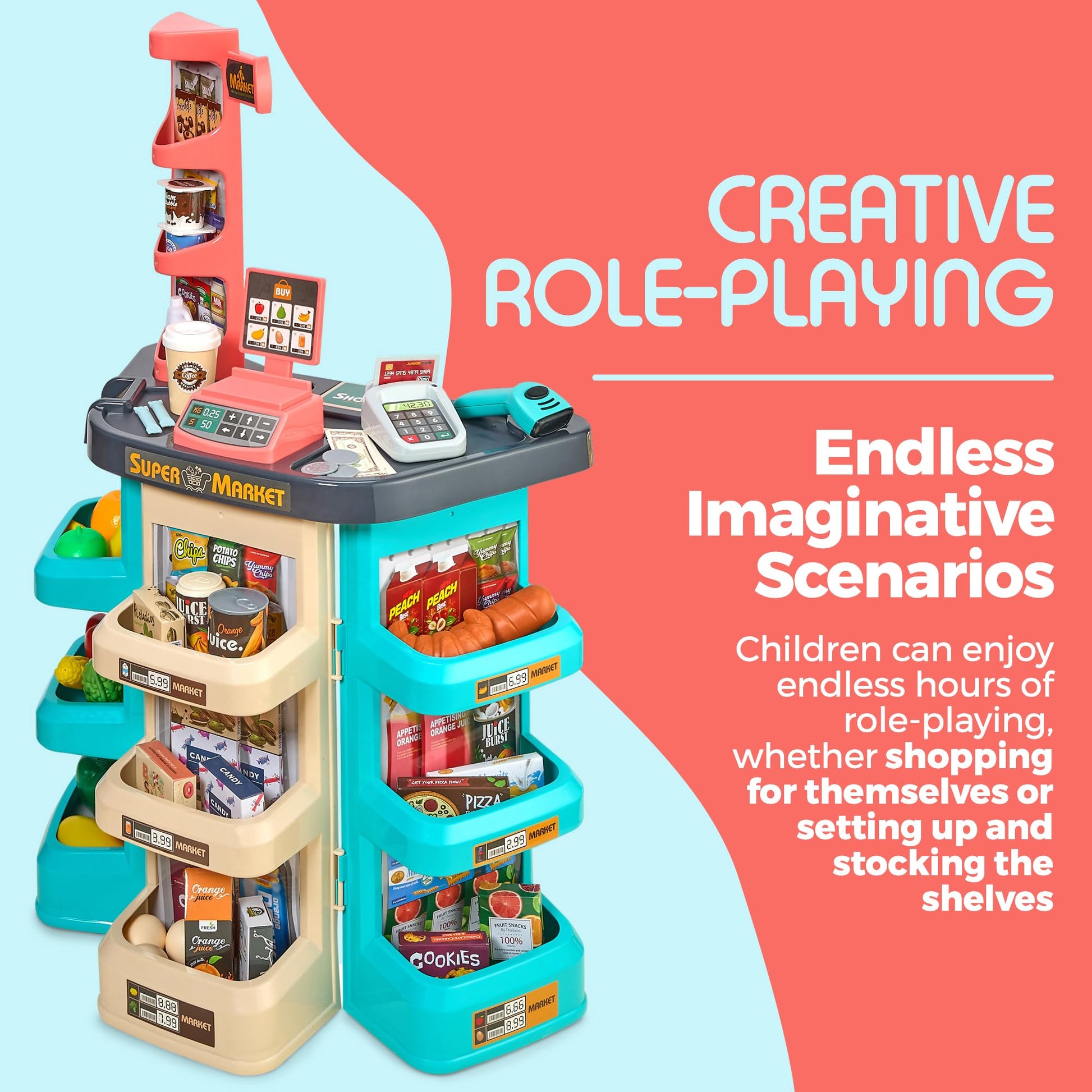 - CREATIVE & IMAGINATIVE PLAY: Let your aspiring entrepreneur get a head start with our Kids Play Supermarket Set. Whether it's shopping for themselves or setting up and stocking the shelves, this playset allows children to enjoy endless hours of role-playing fun. The toy encourages them to be imaginative and create different stories every time they play