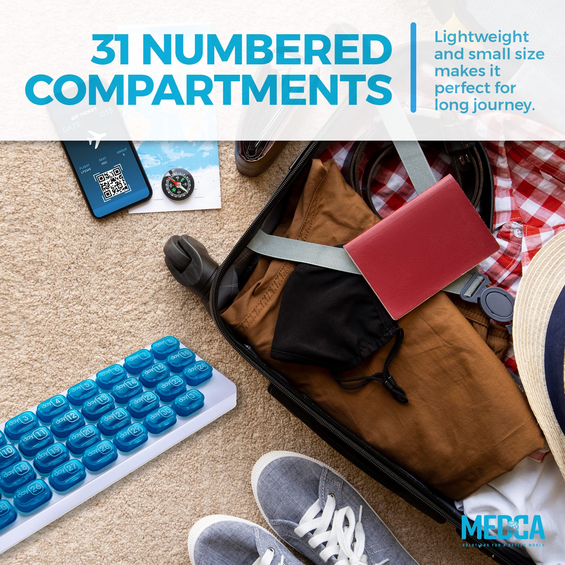 - ORGANIZE A MONTH OF MEDICATION IN ONE NEAT PLACE: Picture being able to put all the pill bottles back in the medicine cabinet and have one place to store a month worth of pills and medication by the day without getting confused. Our new MEDca monthly pill organizer helps you neatly organize your monthly prescription in daily doses using 31 Pop Out Pods that are laid out in a clean, white tray.