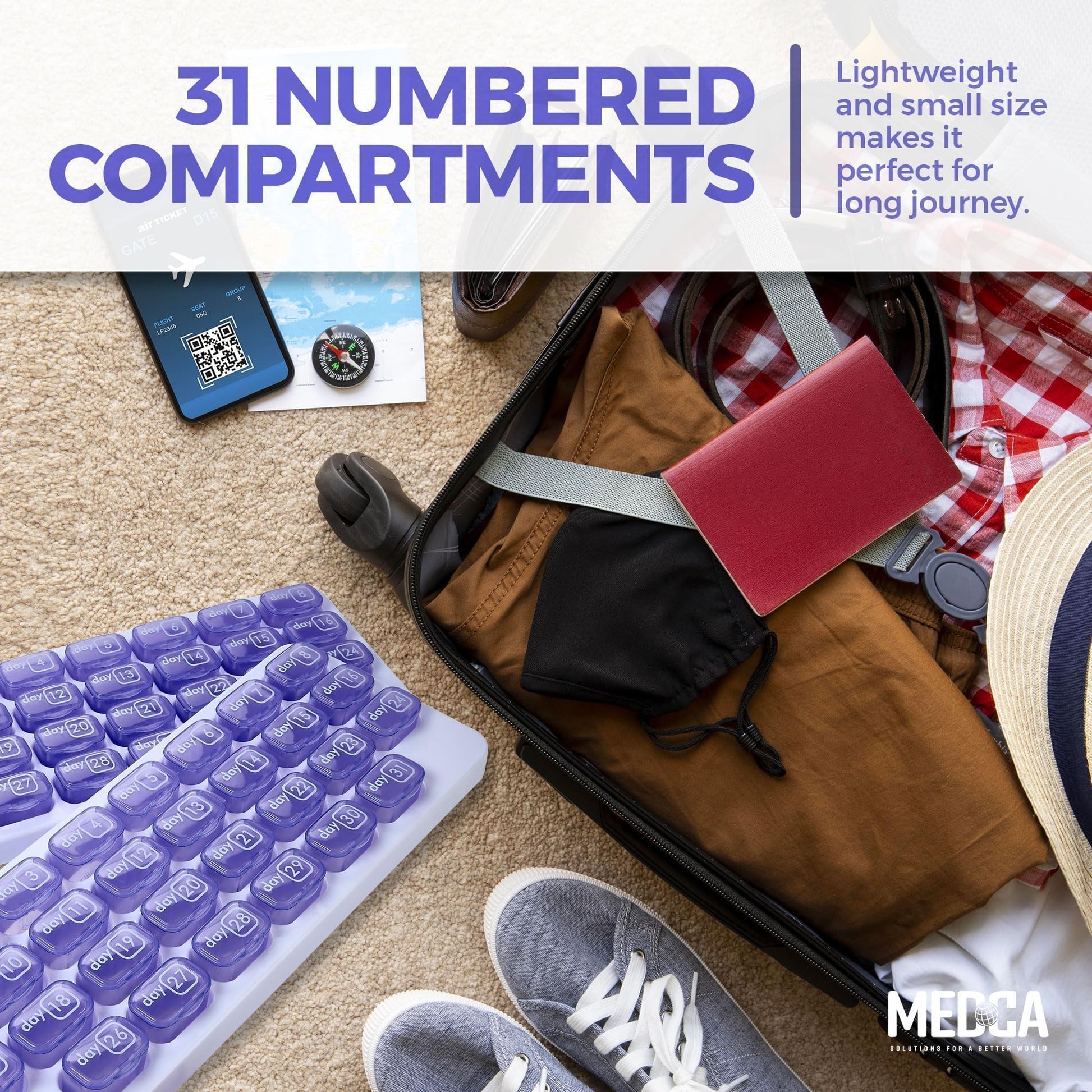- GREATEST VALUE - PACK OF 2 MONTHLY PILL ORGANIZERS: Picture being able to put all the pill bottles back in the medicine cabinet and have one place to store a month worth of pills and medication by the day without getting confused. Our new MEDca monthly pill organizer helps you neatly organize your monthly prescription in daily doses using 31 Pop Out Pods that are laid out in a clean, white tray