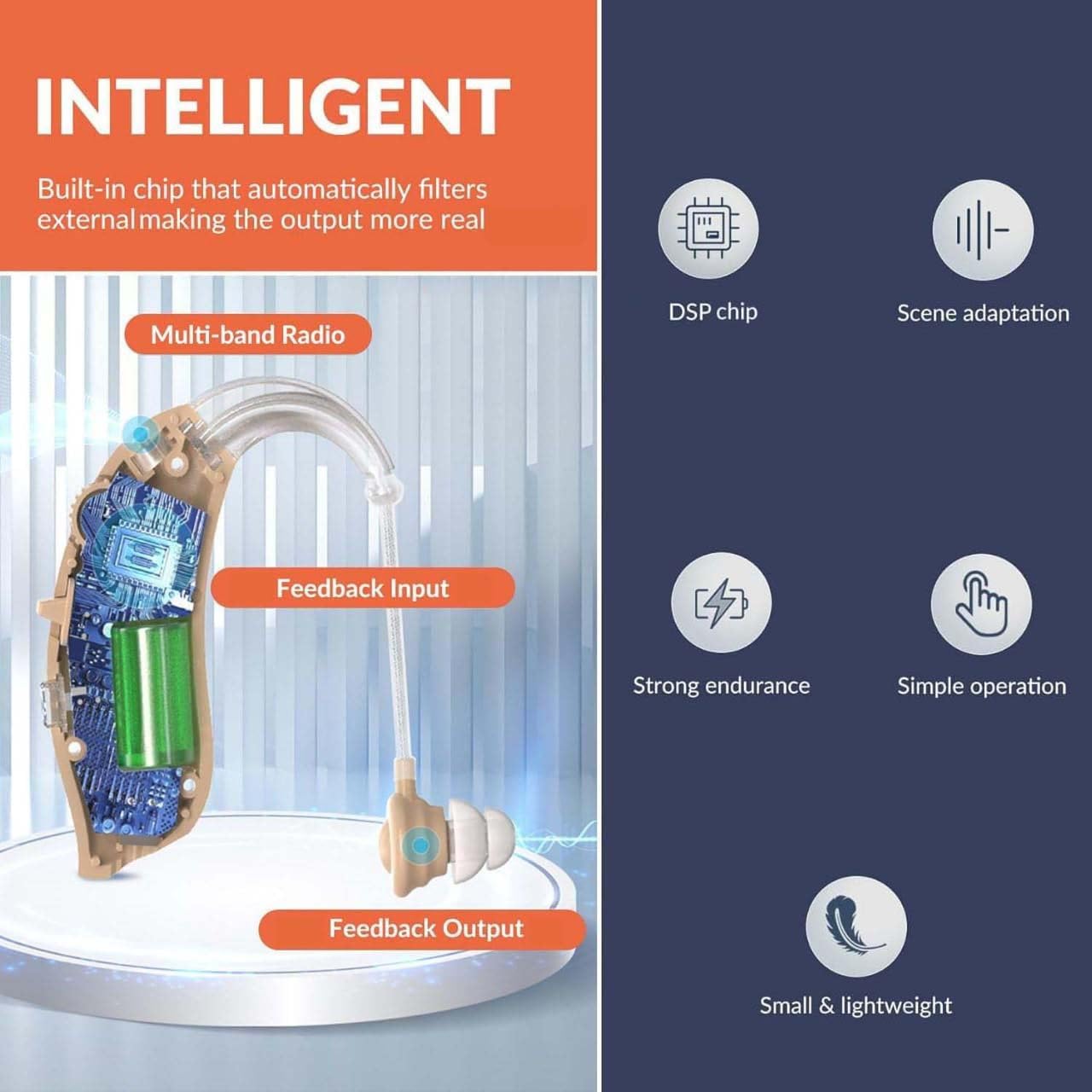 - HD SOUND & INTELLIGENT NOISE REDUCTION: Say goodbye to background noise and hello to clear, realistic sound. Our hearing amplifier is equipped with intelligent noise reduction technology, automatically filtering out external noise. This means you can focus on what truly matters – human voices and important sounds. With real-time sound acquisition functions, our device takes it a step further by enhancing speech clarity and improving the distinction between human voices and ambient sound.