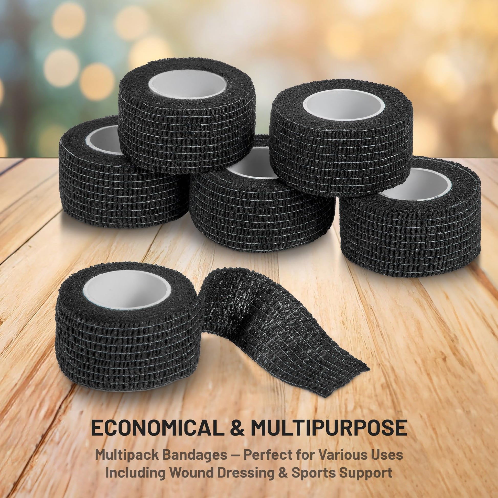 - MULTI-FUNCTIONAL: If you've been looking for adhesive bandage tape that is multifunctional, then your search is over! That's because our medical wrap comes with 6 rolls of black, self adhering tape. It measures in with a 1" width and each roll extends 5 yards! These wraps are perfect for medical use, costumes, sports or any other use you can think of! That means no more boxes of band aids, guaranteed