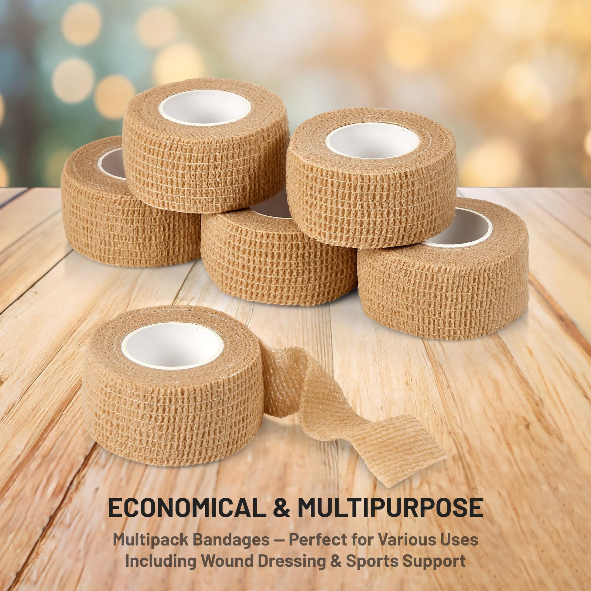 The MEDca Self-Adherent Cohesive Bandages - Pack of 12 Rolls each measure 1" x 5 Yards which means that you will be able to support, secure and protect all of your sprains or strains. The MEDca self adhesive bandage multipack offers cohesive properties which allow the wrap to stick to itself but not to your hair, skin, or other materials. So you can rest assured knowing that our strong self-adherent tape offers you the best support for controlled compression or securing dressings & devices without the need of using pins or rolls of first aid tape to keep in place.
