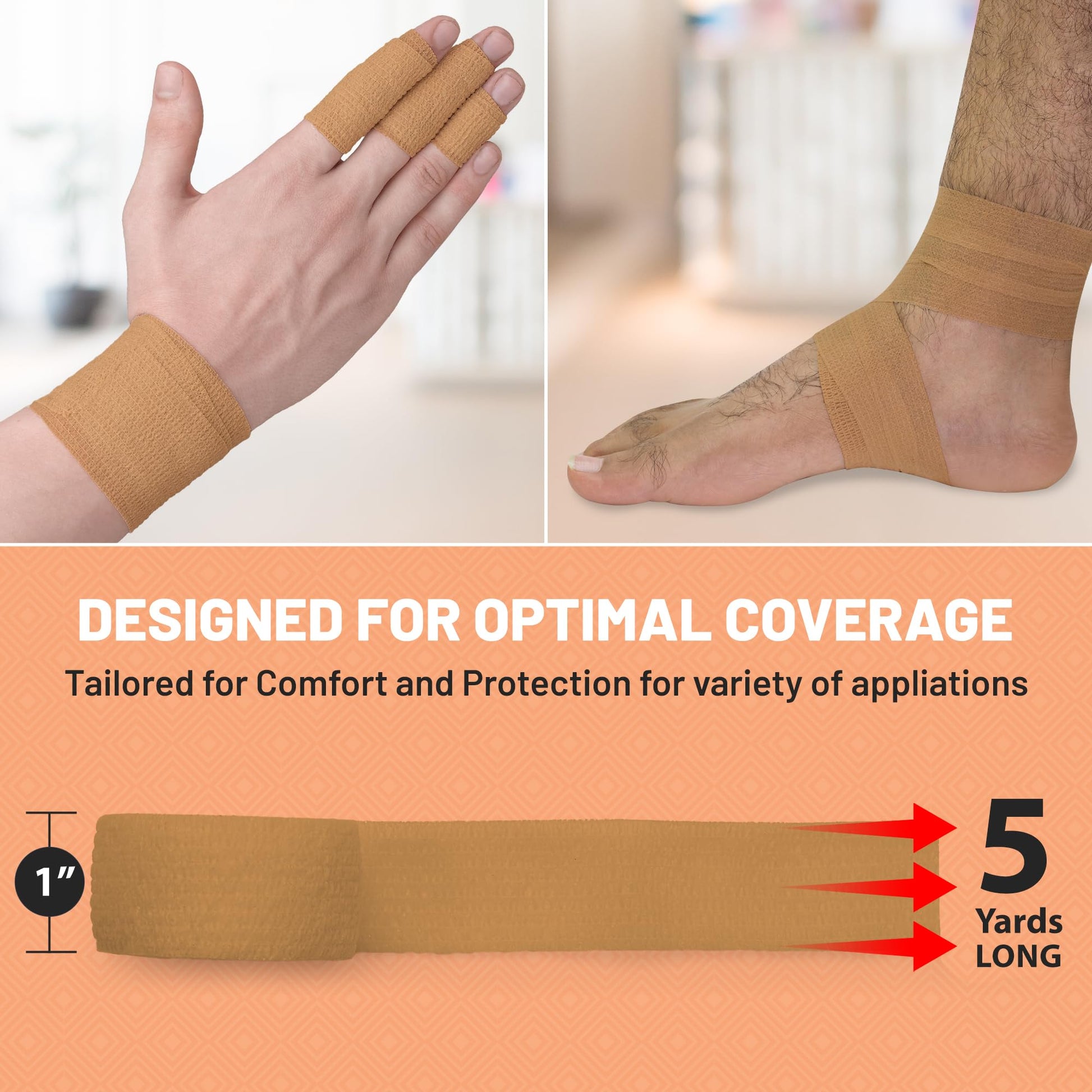 - PACK OF 6 ROLLS: Our Self-Adherent Cohesive Bandages come in a Pack of 6 Rolls each measuring 1" x 5 Yards which means that you will be able to support, secure and protect all of your sprains or strains. With this many rolls you will be able to change your bandages and see how these self-adhesive bandage rolls really go a long way!