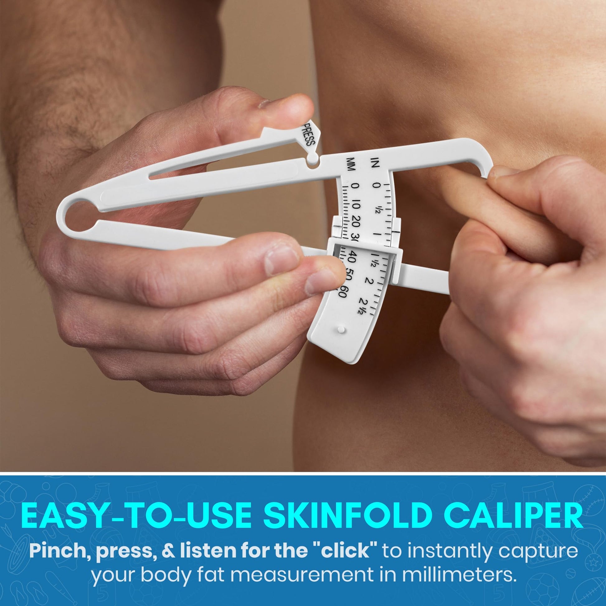 - NEW UPGRADED DESIGN! PINCH, CLICK & READ: Now it has never been easier to measure your body fat by yourself and in the comfort of your own home. Our Personal Body Fat Testers feature a ball socket and slide rule so you can quickly and accurately measure your body fat. Simply move the slide rule to the right, pinch your skin fold, squeeze measuring jaws until the ball socket clicks in place and check your results