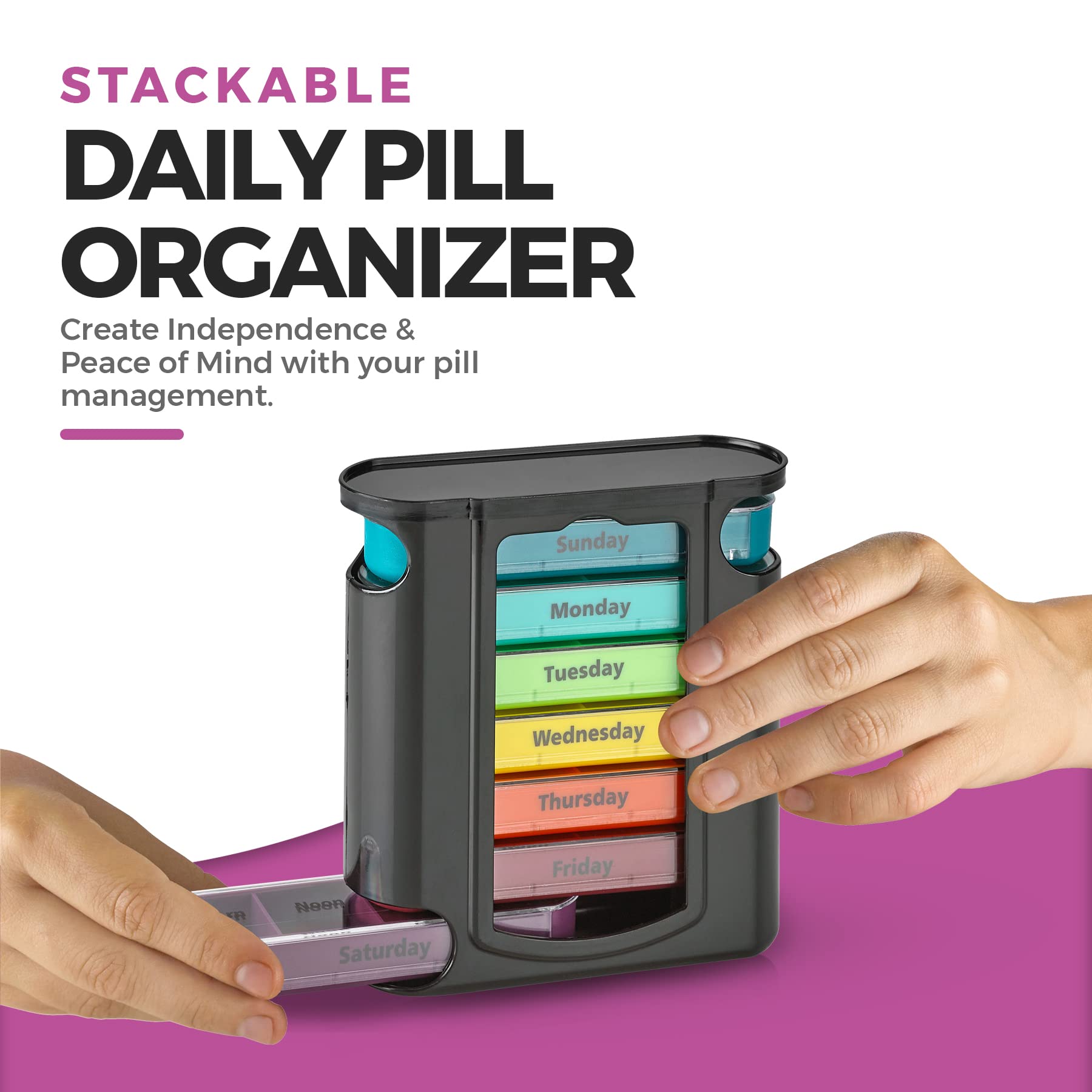 - SLEEK & STYLISH COLORS FOR EACH DAY: Never any confusion or frustration. This stackable weekly pill organizer is innovative, stackable & features 7 daily containers in different unique colors for each day of the week so you will always get the right medicine and dose. Each container is divided into 4 separate compartments that are clearly labeled; morning, noon, evening and bed so you can always take your medicine at the right time