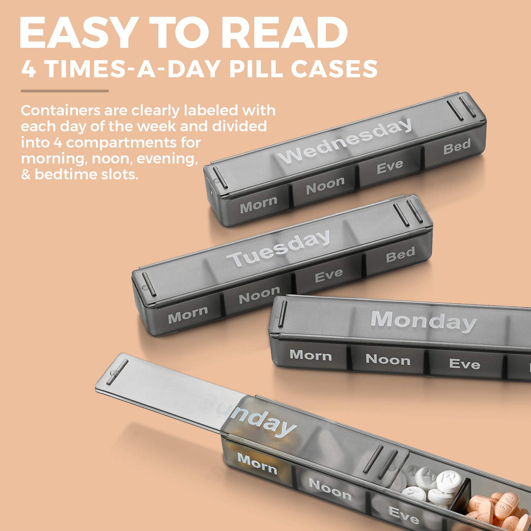 - CLEARLY LABELED COMPARTMENTS WITH DAYS OF THE WEEK: Keep better track of your medication with our pill organizer and never miss a dose again! Containers are clearly labeled with each day of the week and divided into 4 compartments for morning, noon, evening, and bedtime slots. Remove the guesswork of when to take your medication keeping its potency and effectiveness.