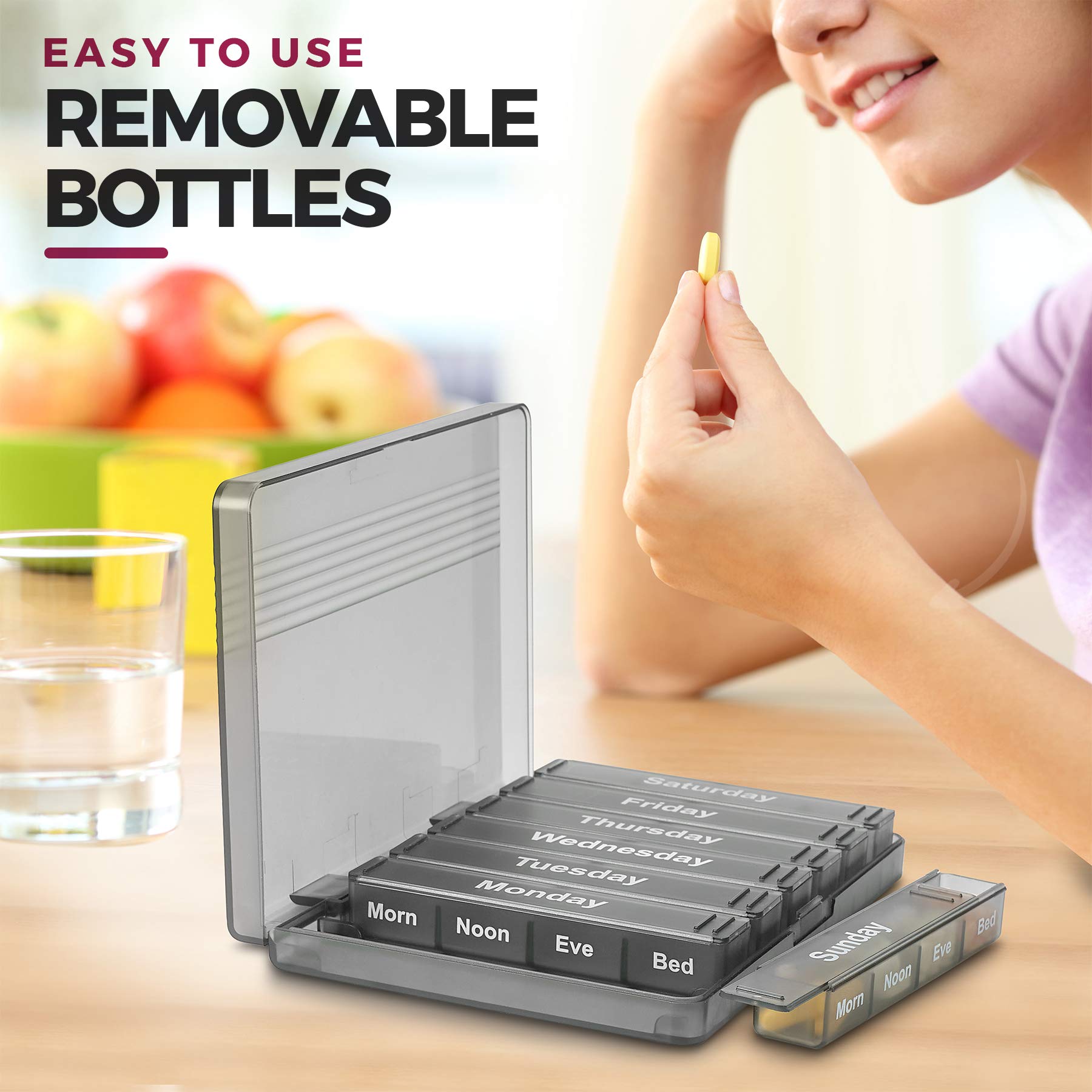 Weekly Pill Planner with Removable Daily Pill Cases Our Weekly Pill Box allows you to get all your medication organized for your convenience. The case holds 7 containers that correspond to each day of the w...