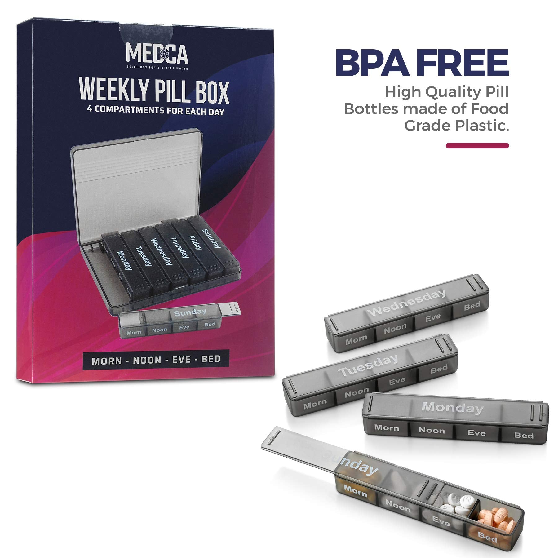 - A CLEAR-CUT WINNER IN QUALITY: Made from 100% BPA-free and food-grade plastic, this MEDca weekly pill case with removable daily compartments is safe to use for any types of medicine, vitamins, supplements, capsule, tablets, and fish oils. To clean, wipe with a clean cloth or wash as needed using mild dishwashing soap. Make sure they are dry before filling.