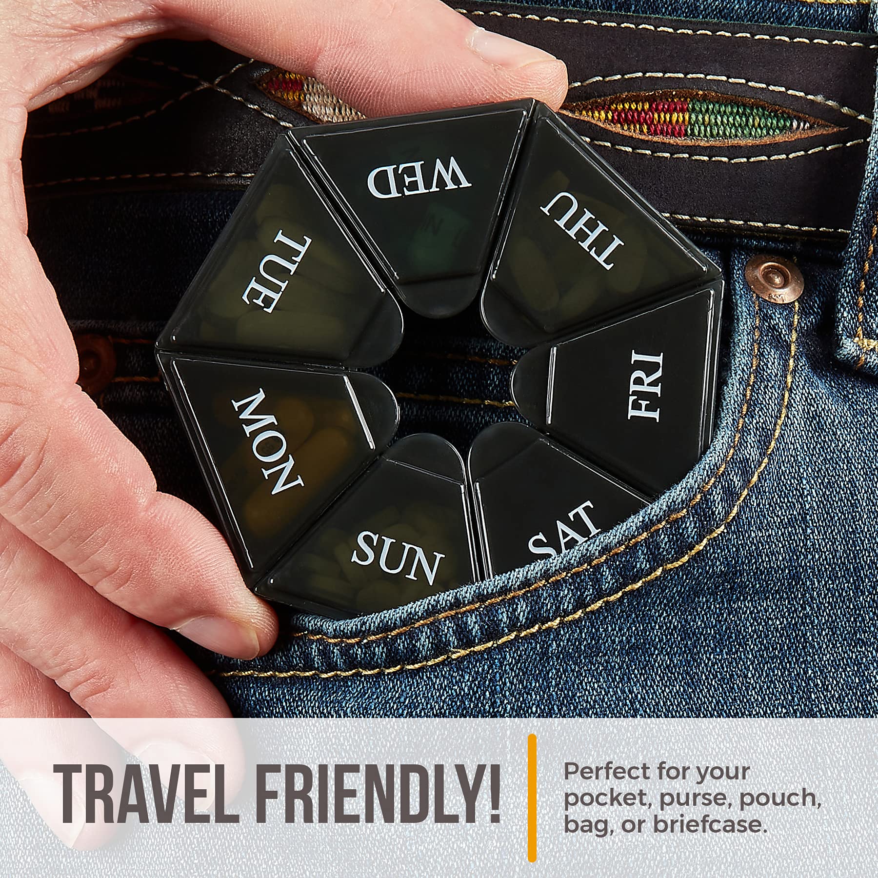 - PACK OF 2 WEEKLY PILL ORGANIZERS: With 7 compartments and a circular round design, this weekly pill organizer is more compact and easier to use. Each compartment is self-contained with its own cover and labeled with the day of the week. The clear and large print labels help you monitor which medication you've already taken preventing miss dosages. The label will not fade easily and will last for an extended lifetime of use