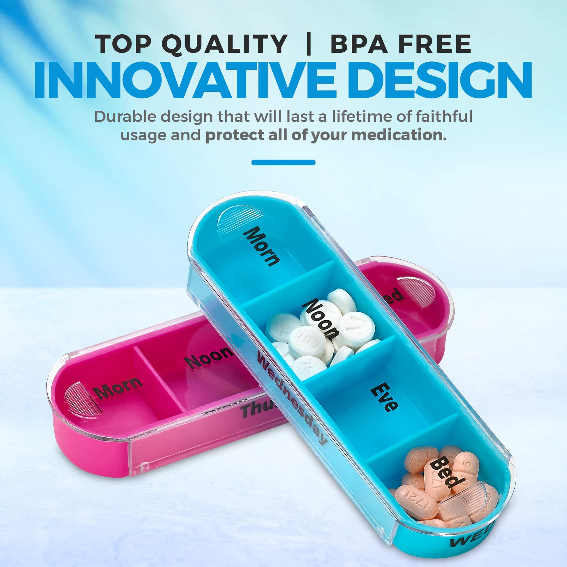 - ✅NEVER SUFFER LOSING OR MISPLACING PILLS AGAIN: The problem with other travel pill organizers is their badly constructed lids that end up losing their stick and won't stay closed anymore. Our pill box solves that problem! Why? That's because our travel pill case have removable sliding lids that make loading weekly medication easy and securely protect all your medicines, vitamins and supplements!